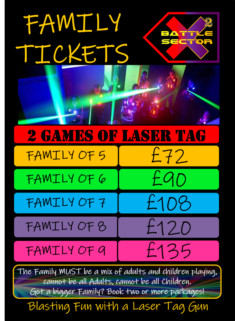 We understand it’s hard to find things for the whole family to do together and if you have a bigger family, cost can be a factor in what you book in for. With this in mind we created the Family Packages. tHE PACKAGE IS FOR 2 GAMES WHICH TAKES US ABOUT AN HOUR TO DO. yOU WILL HAVE A SAFETY BRIEFING, TWO 12 – 15 MINUTES GAMES AND A BREAK IN BETWEEN THE GAMES.