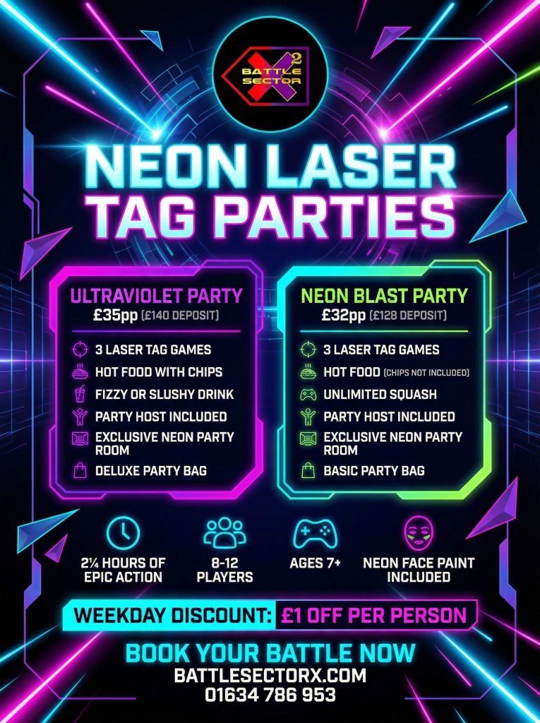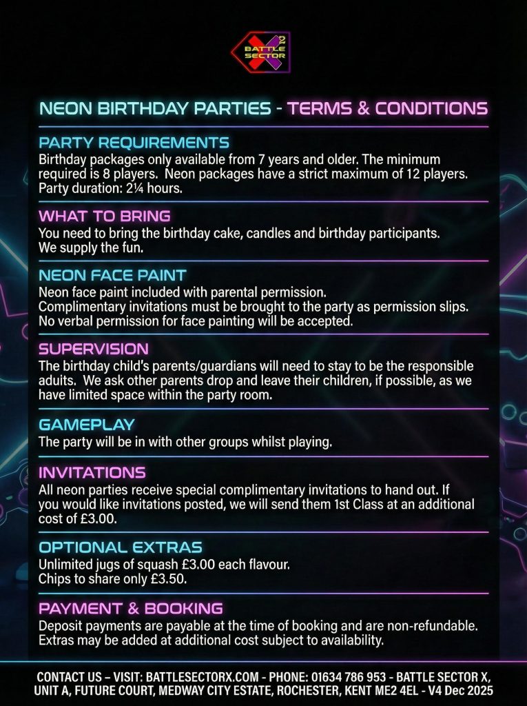 We have the neon and UV Parties too. These come with our exclusive UV Party Room. The Party room has a bluetooth speaker in it so you can add your own background music for the players. The Parties also come with UV Face-painting as part of the price. This party is limited to 8 to 12 players, so not as big as our standard parties, and they would have to join others in their games.