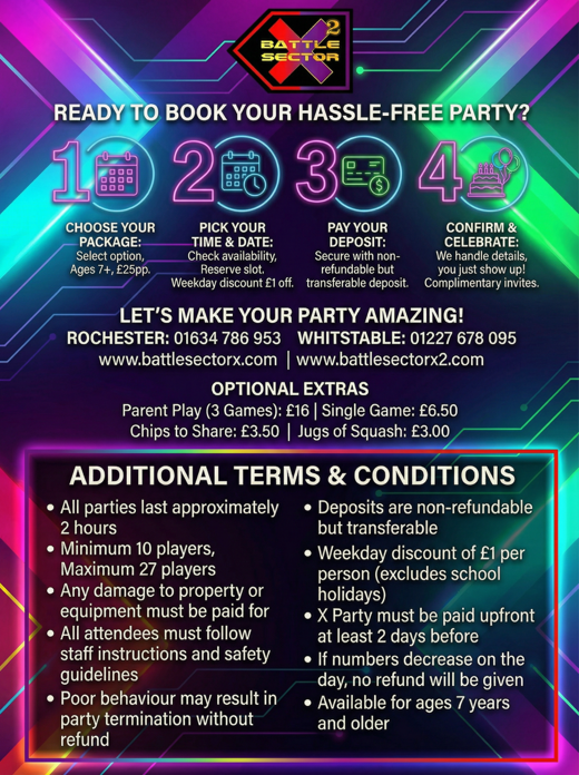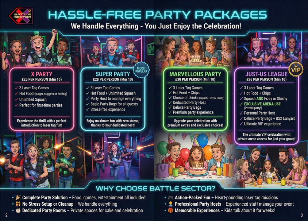 This has no Party Host, but provides 3 Games of Lasertag and Food. No Party Bag and Unlimited Squash as their Drink.